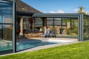 De voormalige schuur, volledig gerenoveerd in 2020, is omgebouwd tot een moderne, lichte woning, ideaal voor gasten of als vakantiewoning. De begane grond bestaat uit een grote woonkamer met open, volledig uitgeruste keuken en brede schuifdeuren die uitkomen op het terras en de omliggende natuur.