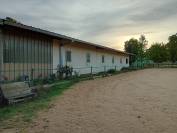 - Ein großes Gebäude, das aus einer Reithalle, einem Lagerbereich für Futter und einer LKW-Garage besteht.
