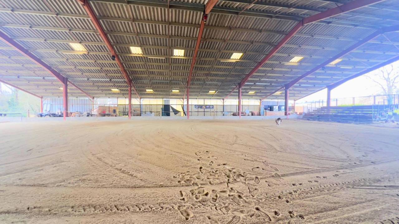 • Un manège éclairé et arrosé de 42 x 25 mètres, complété par une zone de stockage de 12 x 45 mètres pour le foin et le matériel.